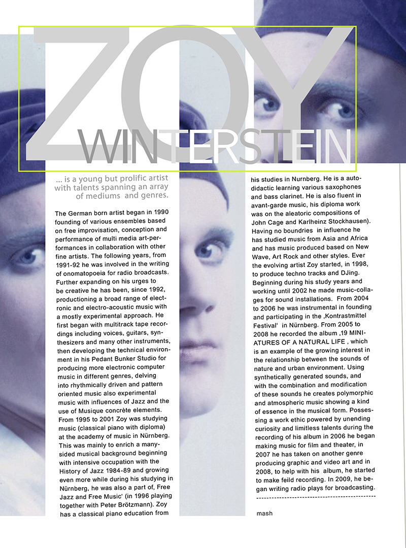 - a many-sided musical background beginning with the intensive occupation with the history of Jazz 1984-89, Free Jazz and Free Music (1996 playing together with Peter Brötzmann),