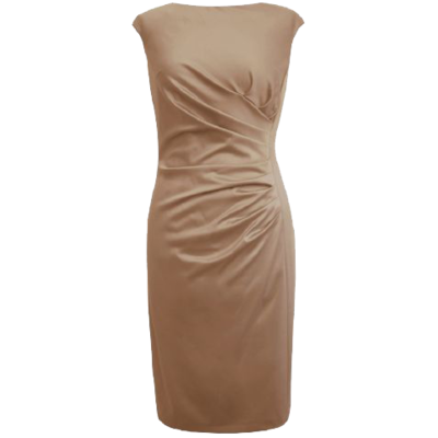 . Der Ausschnitt ist halsnah, die Ärmel sind leicht angeschnitten. Seitliche, asymmetrische Faltendetails verleihen dem Kleid einen modernen, coolen Touch und betonen die schmale Taille. Das Kleid ist feminin auf Figur geschnitten. Dieses Kleid lässt sich wunderbar auch als Standesamtkleid tragen.