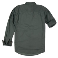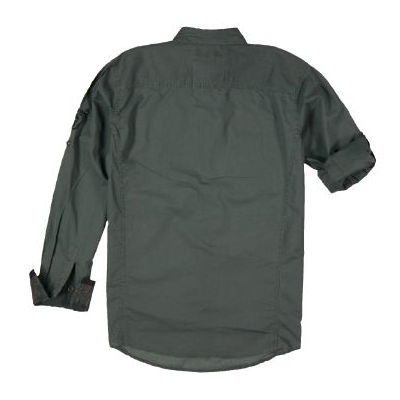 Hemd aus gewaschener Baumwollware mir zwei Bruttaschen, tonigen Nahtdetails, Knopfleiste und Innenkragen mit kontrastfarbenden Nahtdetails verarbeitet, aufwendige Manschettenverarbeitung, Stickerei über der rechten Brust, turn-up Ärmel, Applikation am Ärmel und Metallknöpfe