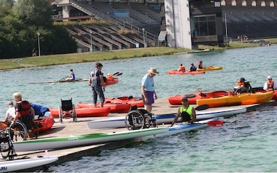 Ebenso unterschiedlich sahen die Anfänge im Kajak aus. Die einen unternahmen erste zarte Versuche im Boot auf der Regattastrecke in Oberschleißheim – erst mit einem Übungsleiter im Zweierkajak, dann im Einerkajak mit und ohne Ausleger. Anfangs noch sehr vorsichtig, dann erschien das Lächeln im Gesicht, und die Sicherheit wuchs. Andere probierten mit Begeisterung die Bootsmodelle aus und wollten sich dann nicht mehr davon trennen … Auch die mitgereisten Betreuer ließen sich schnell vom Paddelvirus anstecken.