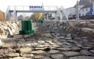 Es sind insgesamt 1.800 Tonnen Steine in den neuen Kanal eingebaut worden. Damit ist die Sohle angehoben und die Uferbereiche besser definiert worden. Der Kanal ist jetzt nicht mehr so tief und nicht mehr so breit. Es wurden insgesamt 16 Fundamente für die Obstacles eingebaut. Die eigentliche Strecke ist mittlerweile fertig modelliert, die gelieferten 80 Obstacles sind bereits eingebaut. Außerdem gibt es jetzt eine Trainingsbeleuchtung (20 Laternen entlang der Strecke – wahrscheinlich besser ausgeleuchtet als jede Bundesstraße) und eine neue, schmucke Stahlbrücke über die Strecke auf den Damm, die die alte marode Holzbrücke ersetzt. Es fehlt nur noch die Erhöhung der Wehrklappen auf der anderen Lenneseite um 30 cm, so dass derzeit noch nicht auf das neue Stauziel angestaut werden kann. Insgesamt sind die Arbeiten gut gelaufen, leider kam das Hochwasser jetzt genau eine Woche zu früh, sodass die Arbeiten des Stahlbauers jetzt nicht möglich sind.