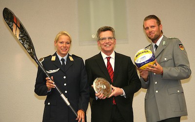 Bild: Ehrung Stabsunteroffizier (FA) Tina Dietze, Kanu Rennsport, Verteidigunsminister Thomas de Maizière und Stabsunteroffizier Julius Brink, Beachvolleyball. ©Bundeswehr/Rütters