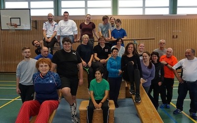 Mit Unterstützung des Sportkreises Fulda-Hünfeld wurden Organisation und Durchführung der „Profilerweiterung Inklusion“ in Fulda gestemmt. In der Heinrich-von-Bibra-Schule konnten theoretische und praktische Kenntnisse vermittelt werden. Die Referenten Michael Müller, Sascha Gräfe, Jan Ries und Stefan Vicen Moreno bekamen Bestnoten von den 17 Teilnehmer*innen. Besonders positiv wurde bewertet, dass man die Fortbildung „heimatnah“ absolvieren konnte. Ein echtes High-Light war nach Ansicht der Teilnehmer*innen der Praxisteil mit dem Special Olympics Team des Kanu-Club-Fulda. Zusammen mit den „Auszubildenden“ zeichnete Sascha Gräfe ein Stundenbild für ein Inklusives Training auf. Im Warm-Up wurden mit einer Übung zum „Entknoten“ alle Berührungsängste abgebaut (siehe Foto).