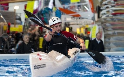 Eingerahmt von Bistro-Stand und Showbühne mit drei Wasserbecken, hatte das Messe-Publikum in der Kanu-Erlebniswelt keine andere Wahl als stehen zu bleiben. Auf der Bühne war kontinuierlich Programm. Seit drei Jahren teilen sich die Kanuten mit den Tauchern eine Bühne. Eine gute Möglichkeit den Zuschauern ein abwechselungsreiches Programm zu bieten. Die Kanuten warben mit einem Programm aus Schnupperpaddeln, Stand-Up-Paddling, Informationen über den Bayrischen Kanu-Verband und der Präsentation ihrer Leistungssportler.