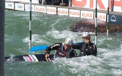 Nach der Silbermedaille mit fehlerfreiem Lauf durch Fabian Dörfler am Vortag gelang dem jungen Canadier-Duo aus Merseburg ein ebenfalls fehlerfreier Lauf durch die 23 Tore des Slalomparcours auf der Olympiastrecke des Jahres 1992 und zudem der beste Lauf auf ihrer Weltcuptournee quer durch Europa. „Die Strecke war eigentlich nicht sehr schwierig ausgehangen, aber viele Tore hingen an ungewöhnlichen Stellen und ließen sich nicht wirklich gut mit dem Wasser befahren. Am Ende sind wir sehr froh über diesen Bronzeplatz. Es ist unsere erste Medaille im Weltcup und in einem internationalen Klasserennen überhaupt“, freute sich Robert Behling über den gemeinsamen Erfolg. Nachdem beide zunächst als Zweite geführt wurden, korrigierte die Jury das Ergebnis mit der Folge, dass dem slowakischen Boot Skantar/Skantar nunmehr ein fehlerfreier Lauf zugeschrieben und das DKV-Boot somit auf den Bronzeplatz verdrängt wurde. „Die Kampfrichterleistungen hier in Spanien waren extrem schlecht. Es gab ständig Fehlentscheidungen und Ergebniskorrekturen. Wir hätten fast das Finale nicht erreicht, weil auch wir eine zusätzliche Berührung angeschrieben bekamen“, schimpfte Thomas Becker nach dem ganzen Hin und Her. Das zweite deutsche Boot mit Franz Anton und Jan Benzien platzierte sich erneut im guten Mittelfeld und kam auf Platz sieben.