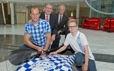 Zur Prämienübergabe und zum Fototermin mit Pressevertretern und Center-TV brachten Ben und Brigitte Verhoef gemeinsam mit Max ein fotogenes Wettkampfboot des Blau-Weiss in die Eingangshalle der Sparkasse KölnBonn. Um zu zeigen, welche Sportler beim Blau-Weiss von der Prämie profitieren werden, war auch Blau-Weiss Köln Jugendsprecher Tom Wielpütz mit dabei.