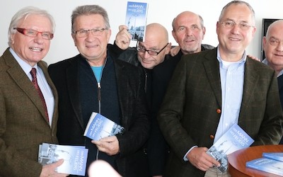Auf dem Foto: von links: Karl Heinz Englet mit den Gastautoren Horst Woppowa, Arno Loeb, Peter Bulach, Rudi Reisch und Christian Doser bei der Präsentation des Buches