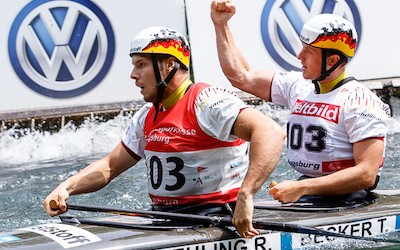 Gold holten im Canadier-Zweier die Merseburger Robert Behling und Thomas Becker. Die Europameister von 2015 verwiesen die Tschechen Jonas Kaspar/Marek Sindler sowie Gauthier Klauss/Matthieu Peche (Frankreich) auf die Plätze. „Es ist immer was Besonderes vor eigenem Publikum zu gewinnen. Die Zuschauer haben uns runtergeschrien zu der Musik, die wir uns vorher ausgesucht hatten“, freute sich Thomas Becker. Der Disco-Pogo von den Atzen war ganz offensichtlich eine gute Wahl. „Endlich mal fehlerfrei“, war der Hintermann der Besatzung erleichtert, „wir waren schon zur EM in Tacen supergut drauf, haben dann zweimal berührt, auch in Prag hatten wir einen Fahrfehler. Wir haben viel gemacht im Winter und es ist einfach toll, jetzt etwas wiederzubekommen.“ Mit den beiden Leipziger Booten Franz Anton/Jan Benzien auf Rang vier sowie David Schröder/Nico Bettge auf dem achten Rang machten die deutschen Zweier einen starken Eindruck.